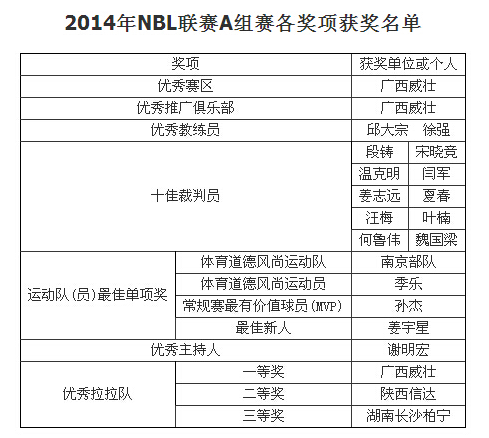 2014年10月21日体育总局篮球中心根据2014年NBL联赛官方手册中有关奖项的评选办法和标准,评选出了本赛季的各个奖项。广西威壮荣获优秀赛区、优秀推广俱乐部、优秀啦啦队三个团体奖项,邱大宗教练获得优秀教练员奖项、季乐获得体育道德风尚运动员奖项、孙杰获得常规赛最有价值球员(MVP) 奖项。