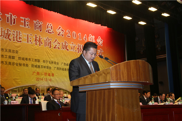 自治区党委原书记陈辉光,自治区原副主席雷宇,中共防城港市委书记金湘军,中共玉林市委常委、统战部部长杨红分别在会上讲话。陈辉光、雷宇两位自治区老领导,分别在讲话中,充分肯定玉林市玉商总会成立以来所取得的成绩,并对该会未来发展寄予厚望。金湘军书记深情回顾了在玉林工作14年,在玉林市“玉商文化”的感召下,玉林市玉商总会所处的地位和所起的作用;同时,充分肯定了防城港玉商为该市经济社会发展所作出的贡献,并对防城港玉林商会提出了要求。杨红部长在讲话中,充分肯定了玉林市玉商总会2014年所取得的成绩,充分肯定了防城港玉商为当地经济社会发展所作出的贡献,并对玉商总会、防城港玉林商会寄予厚望。