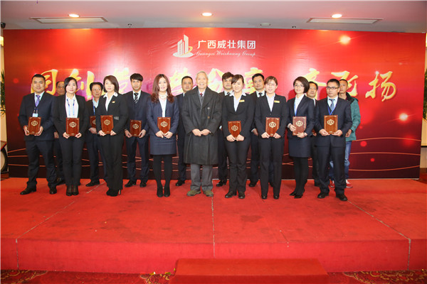 2015年2月13日下午,“同创造·共分享·齐飞扬”广西威壮集团2014年终总结暨表彰大会在南宁市铂丽菲酒店隆重召开,集团旗下所有子公司包括威壮房地产有限公司、浩洋房地产、威壮交通建筑设施有限公司、南宁铂丽菲酒店、仙葫机动车检验站等共200余名员工代表参加了此次大会。出席本次大会的还有广西区政协提案委原副主任庞隆昌先生;广西区人民政府原副秘书长张振东先生;广西区人事厅原副厅长、威壮集团顾问黄业恩先生等领导嘉宾。