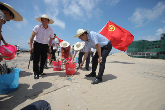 揭牌仪式结束后,江山工委莫小林书记、威壮集团黄东董事长共同带领浩洋地产公司党员和员工、江山工管委机关党支部、管理处党支部全体党员,顶着烈日在海上世界·一墅江山项目沙滩共同参与“生态江山半岛,清洁美丽海滩”党员活动。