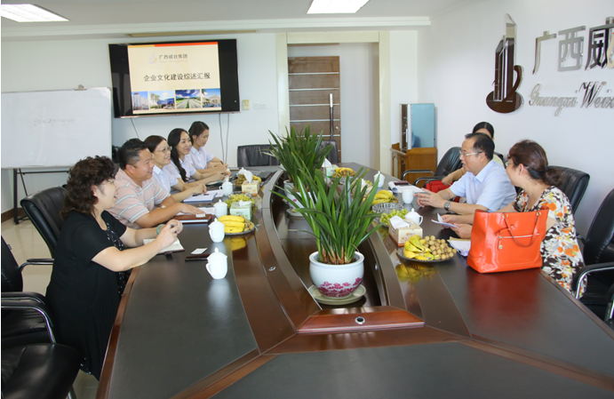 同时,由董事长助理叶卫东向自治区工商联调研考核组一行介绍威壮集团企业文化管理体系建设方面的相关情况,总结了威壮丰富多彩的企业文化活动、培训拓展训练、员工队伍建设、企业文化展示平台途径、公司社会公益活动及目前公司企业文化建设工作取得的成就等各方面工作。并表示将在自治区工商联各位领导的指导和支持下,以创建广西民营企业文化建设示范点活动为契机,按照“创新、协调、绿色、开放、共享”的总体要求,坚持文化建设、维护管理、人力资源管理三管齐下,不断提升企业凝聚力和向心力,推动我集团企业文化建设更上新台阶。