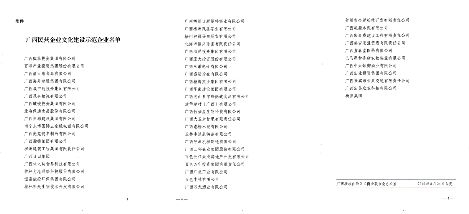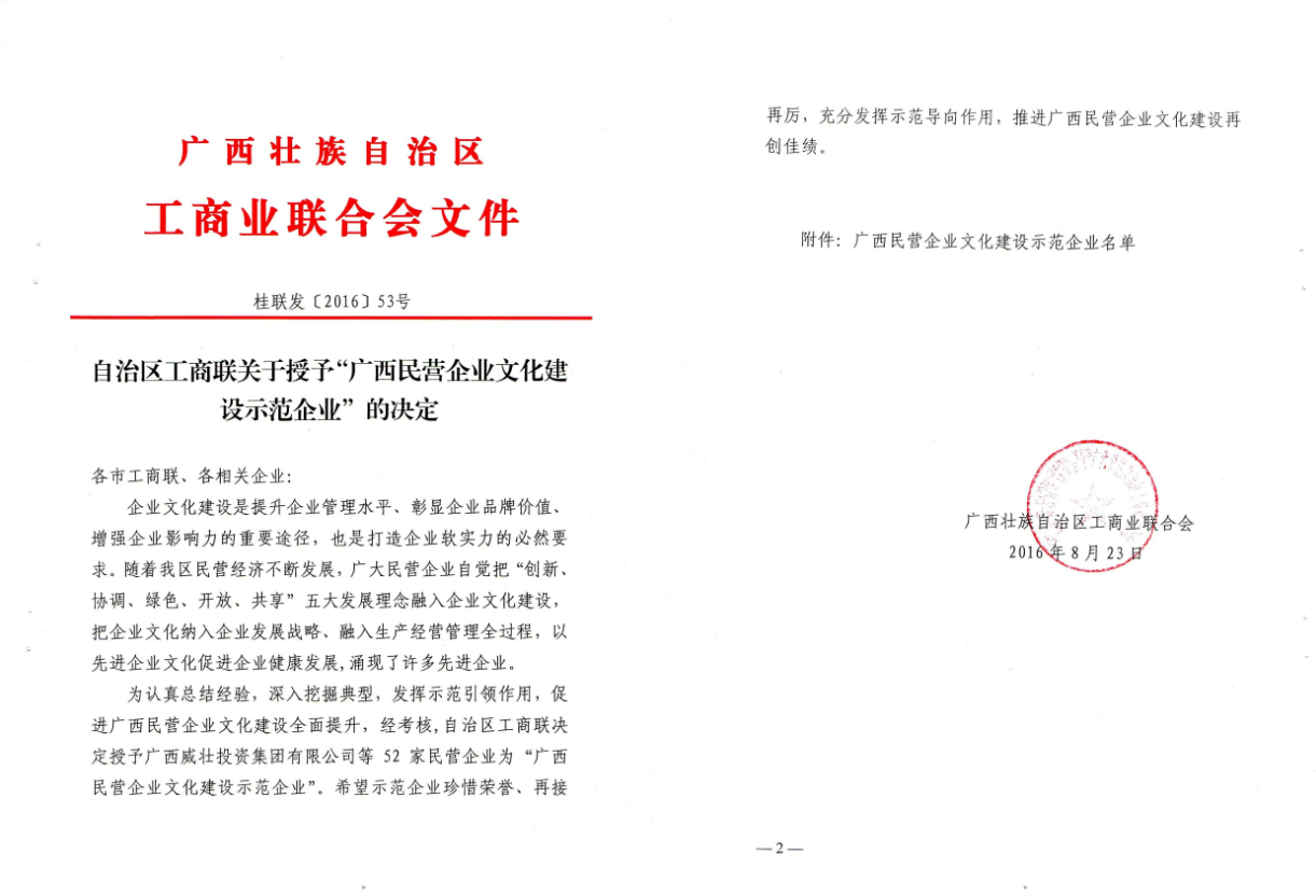 在自治区工商联的组织领导下,从企业对本单位的企业文化建设工作总结、申报,到自治区工商联陈宁副主席带队到企业走访、调研、考核、评价,历时三个多月的审核考评工作,终于在2016年8月24日由自治区工商联印发了桂联发【2016】53号文“自治区工商联关于授予广西民营企业文化建设示范企业的决定”,授予了广西威壮投资集团有限公司等52家民营企业为“广西民营企业文化建设示范企业”,这是上级管理部门对我集团企业文化建设工作的充分肯定。
