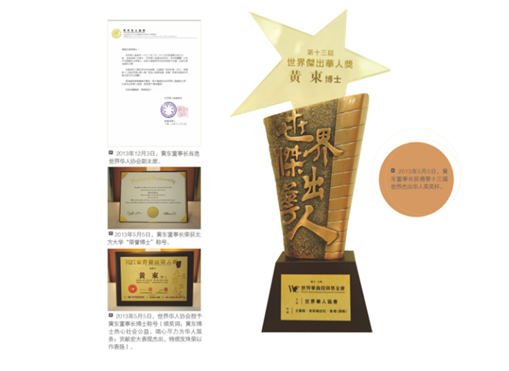 多年来,黄东董事长以高度的责任心积极参与社会事务及公益事业,以真诚回报社会,积极参与扶贫济困、关爱老弱病残等慈善活动,积极参与和推动广西光彩事业的发展,受到了各级政府、社会各界及家乡人民的充分肯定和高度评价。2013年5月4日,黄东董事长凭借其在商业领域杰出的才干和对社会的卓越贡献,荣获“第十三届世界杰出华人”称号,并颁授了荣誉博士证书,他也是该奖项成立至今唯一一名广西籍获奖者。