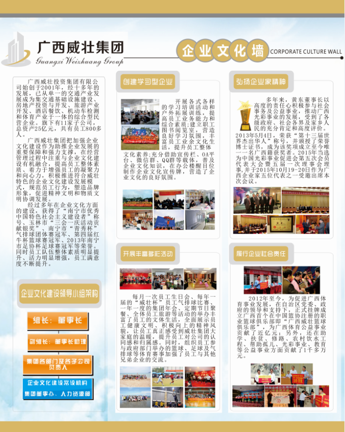 广西威壮集团把加强企业文化建设作为助推企业发展的重要保障和强力支撑,在经营管理过程中注重与企业文化建设有机融合,着力于提高员工整体素质、着力于增强员工的凝聚力和向心力,积极推进符合威壮特色的企业文化建设发展模式,规范员工行为,塑造品牌形象,促进精神文明和物质文明协调发展。