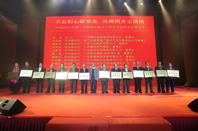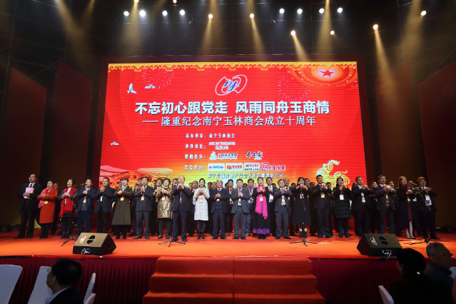 2017年1月11日,不忘初心跟党走、风雨同舟玉商情——隆重纪念南宁玉林商会成立十周年大会在南宁市国际会展中心朱槿花厅召开。自治区党委原书记陈辉光,自治区人大常委会原副主任韦家能,自治区政协原副主席潘鸿权,自治区检察院原检察长张少康,中共南宁市委统战部副部长张献辉,广西区、南宁市、玉林市有关领导和南宁玉林商会全体会员共1000多人参加会议。