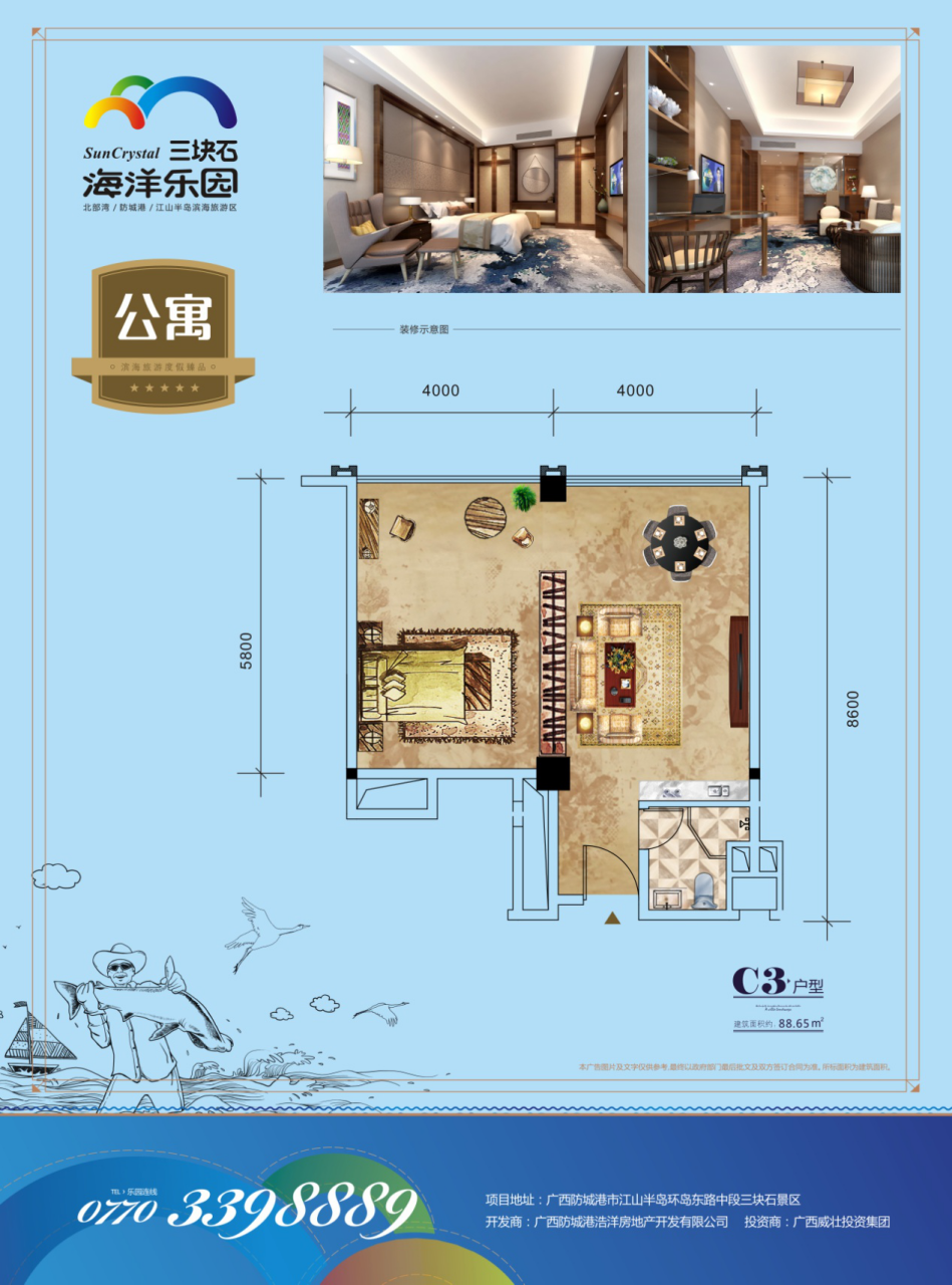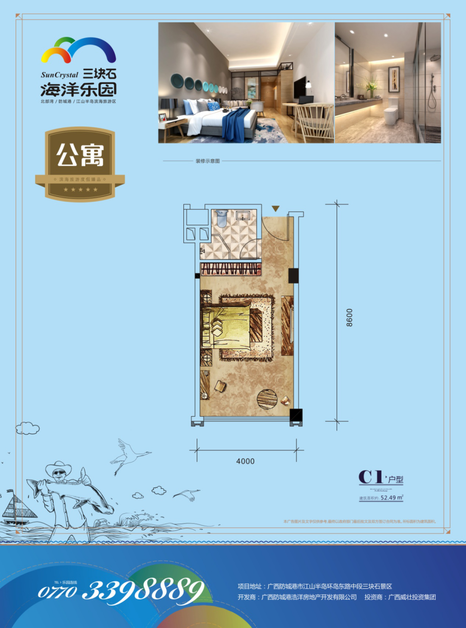 本次一期销售的公寓位于五星级酒店内C区3至8层,户型面积50至80㎡,面朝大海,春暖花开。园区配套的无边泳池、滨海酒吧、浪漫婚礼草坪、爱情小岛、游艇码头等大师手笔滨海园林景观已实景呈现,不可有不再有的全景海景房邀您的品鉴!