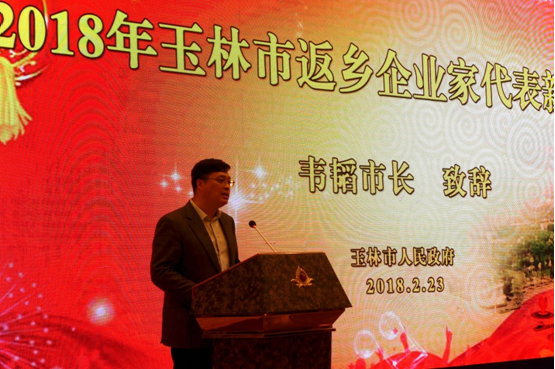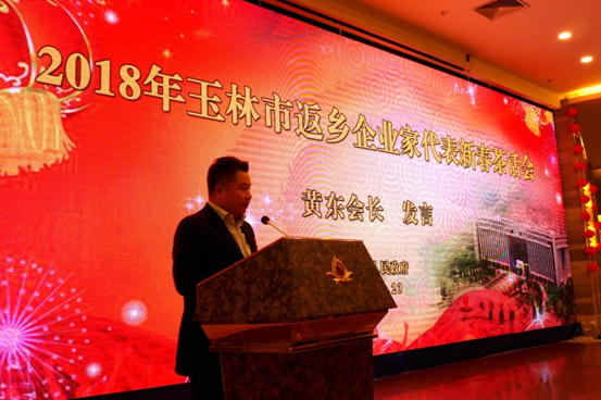 2018年2月23日,由玉林市委市政府主办的2018年玉林市返乡企业家代表新春茶话会在玉林城区举行。我集团黄东董事长作为全国工商联执委、广西壮族自治区政协常委、广西壮族自治区工商联副主席、玉商总会会长受邀出席并作为玉商代表在会上发表重要讲话。