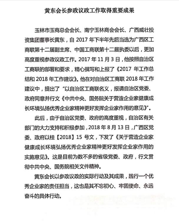 黄东董事长自当选广西区工商联第十二届副主席、中国工商第十二届执委以来,认真履行义务,积极参政议政,不忘初心,牢记使命,用行动展现了当代优秀企业家应有的责任与担当,得到了自治区党委、政府的高度重视和有关部门的大力支持。