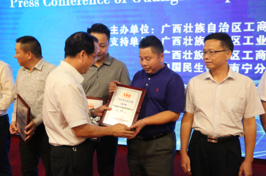 会上发布了2018广西民营企业100强榜单、2018广西民营企业制造业50强榜单、2018最具潜力企业榜单,其中公布的广西民营企业100强榜单中,广西威壮集团位居榜单第73名,自治区工商联副主席陈宁为我集团董事长黄东颁发了获奖证书。