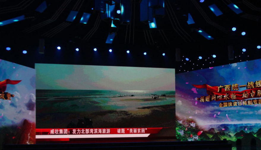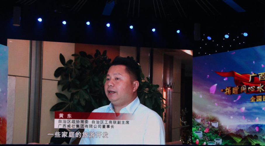 节目通过纪录短片、嘉宾访谈、文艺表演、捐赠仪式等形式展现,现场播放的VCR《广西统一战线:画出最大同心元 奏响脱贫协奏曲》中,黄东董事长以威壮集团:发力北部湾滨海旅游 破题“美丽贫困”为题,讲述集团在精准扶贫行动当中如何通过产业扶贫特色模式开展工作。