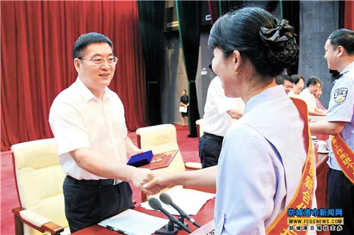防城港市委书记、市人大常委会主任李延强为防城港萨维尔度假酒店“先进个人”获得者吴海珍颁奖。 防城港日报记者 苏 靖 摄