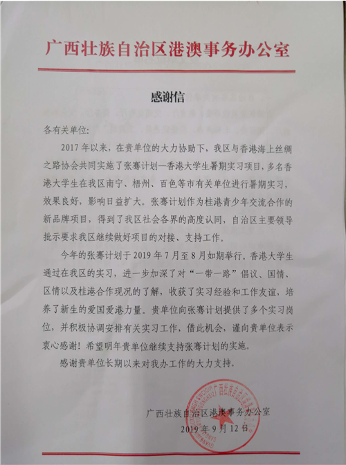 近年来,广西威壮集团积极配合张骞计划-香港大学生暑期实习项目,协调安排实习岗位,进一步加深了香港大学生对“一带一路”倡议、国情、区情以及桂港合作现况的了解,培养了新生的爱国爱港力量。 为此,广西壮族自治区港澳事务办公室特向广西威壮集团发来感谢信!
