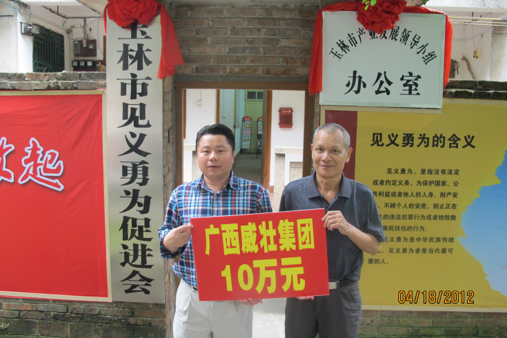 为推动玉林市见义勇为事业的不断进步,为玉林市见义勇为工作提供经费保障,确保见义勇为促进会各项工作正常开展,我集团黄东董事长代表威壮集团捐款10万元。