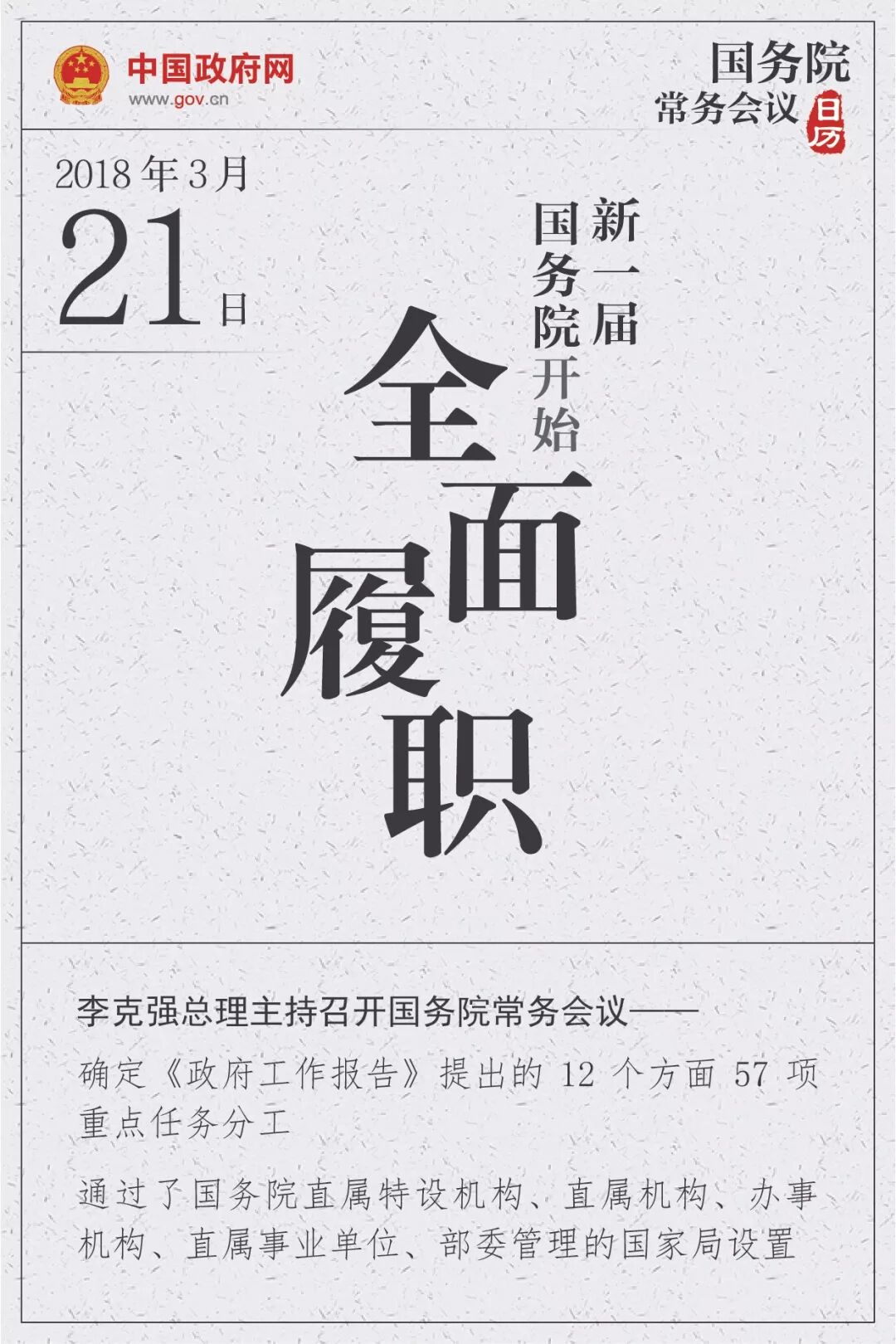 “从今天起,新一届政府工作就正式启动了。”3月21日,李克强总理在两会后国务院召开的首次常务会议上说,“各部门要积极作为、勇于担当、对号入座,保质保量按时完成《政府工作报告》确定的各项重点工作和任务。”