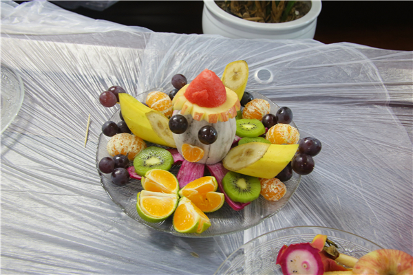 13位寿星分为3组进行水果拼盘大赛,开始之前,寿星们早已摩拳擦掌、跃跃欲试。当比赛声响起时,大家各显神通,发挥自己的创意和想象,有的“大开杀戒”,西瓜红色液汁和各式各样的果肉堆满了桌面,一片狼藉;有的却仍然“闲情逸致”着慢悠悠地摆弄着桃子、葡萄、火龙果,从容不迫地摆放到盘中。不一会儿,三组全新出炉的水果拼盘摆上了展示台,丰富的想象力和成员的团队协作将水果做出“火锅窜窜”、“人偶娃娃” 等各种奇特的造型!