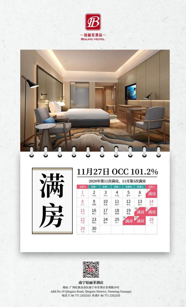 11月27日-30日,第十七届中国-东盟博览会和中国-东盟商务与投资峰会在南宁举行。作为中国-东盟商务合作酒店,南宁铂丽菲酒店严格执行自治区人民政府的相关规定,积极配合消防、卫生、食检等相关部门做好酒店的安全、卫生工作,保证服务质量,认真做好2020年“两会”的接待服务工作。中国-东盟博览会期间,南宁铂丽菲酒店迎来客流高峰,客房多次预约爆满。11月27日当天,铂丽菲酒店取得月度单日房收最高、每房收益最高成绩。此外,11月铂丽菲酒店达到5次满房入住率,20、21日,26、27日,更是分别连续2天满房,酒店进入冬季客房接待高峰期。