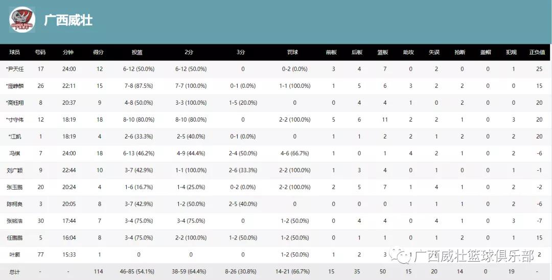 本场比赛,5人得分上双。寸守伟18分11篮板,冯祺18分、庞峥麟15分6篮板、尹天任12分7篮板、刘广颖10分。