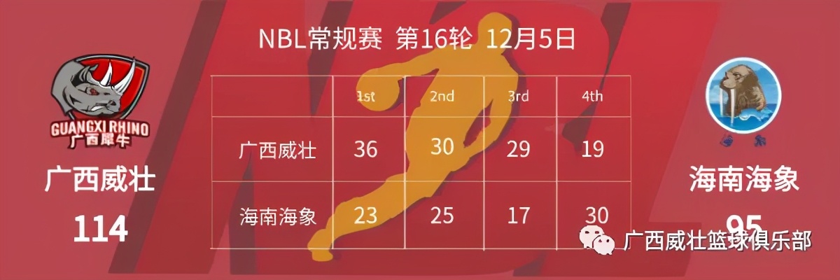 2020NBL第二阶段比赛继续进行,广西威壮在12月5日晚的第16轮比赛中以114比95轻取海南海象,继续领跑积分榜。