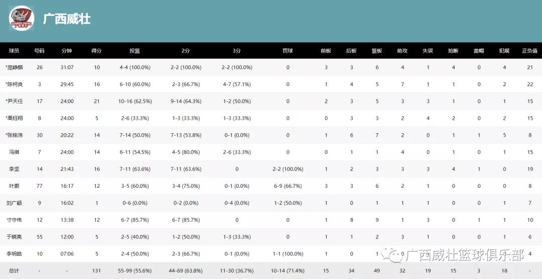 本场比赛8人得分上双,尹天任21分领衔、陈柯良、李坚16分、张铭浩、冯祺14分、寸守伟12分9篮板、叶灏12分7篮板、庞峥麟10分