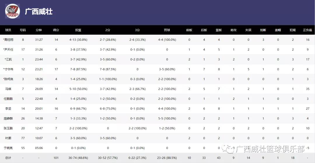 寸守伟17分8篮板5助攻、李坚16分8篮板、冯祺14分7篮板、高钰翔14分4篮板