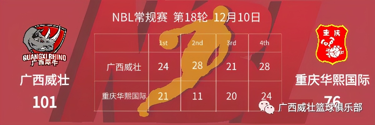12月10日,在2020NBL联赛第18轮比赛中,广西威壮以101:76力克重庆华熙国际,取得常规赛第15场胜利。