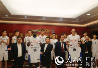 在新闻发布会的最后,广西篮球协会主席韦茂繁、玉林市文化广电体育和旅游局党组副书记、副局长黄俊荣,广西威壮集团董事长黄东、广西篮球协会副主席李大业共同将广西威壮篮球俱乐部球衣赠与威壮外援,并激励威壮队员们奋勇拼搏,力争冠军,再创广西篮球辉煌。
