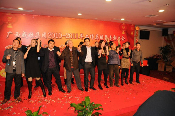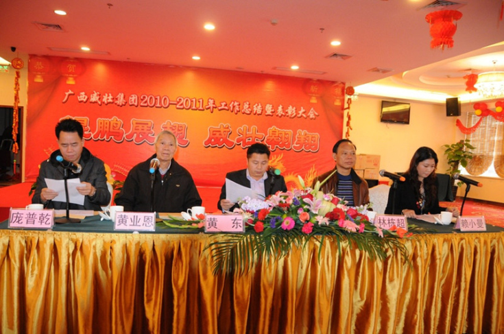 2012年1月16日,广西威壮集团2010-2011年工作总结暨表彰大会在南宁铂丽菲酒店三楼综合大厅召开。集团领导及全体员工参加了本次年度盛会,会议还特别邀请了集团总顾问黄业恩先生出席。