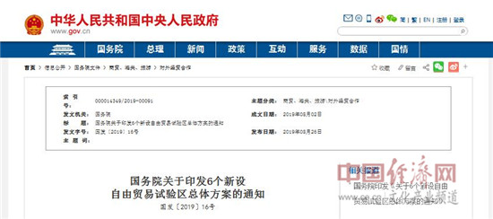 国务院关于印发6个新设自由贸易试验区总体方案的通知
