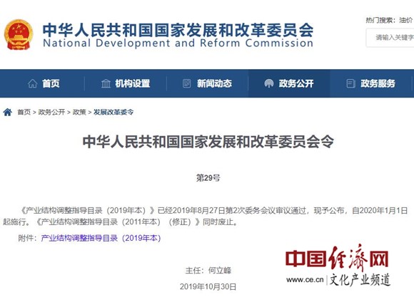 近日,国家发展和改革委员会令第29号发布,《产业结构调整指导目录(2019年本)》已经2019年8月27日第2次委务会议审议通过,现予公布,自2020年1月1日起施行。《产业结构调整指导目录(2011年本)(修正)》同时废止。据经济日报-中国经济网文化产业频道(微信号:cewenhua)了解,《产业结构调整指导目录》是《促进产业结构调整暂行规定》的配套文件,是引导投资方向,政府管理投资项目,制定和实施财税、信贷、土地、进出口等政策的重要依据。由鼓励、限制和淘汰三类目录组成。鼓励类主要是对经济社会发展有重要促进作用,有利于节约资源、保护环境、产业结构优化升级,需要采取政策措施予以鼓励和支持的关键技术、装备及产品。