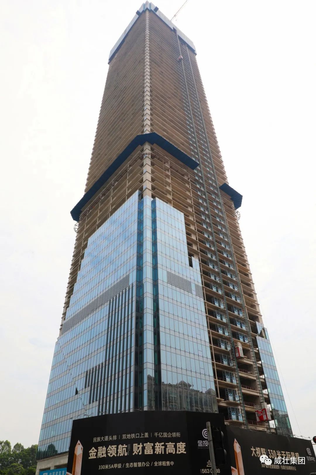 5月21日,广西威壮集团旗下,民族大道头排、东盟商务区核心330米甲级写字楼——金投中心电梯进场安装。同期项目公共精装单位进场,机电安装等配套工程按计划快速推进中。截止至5月28日,项目幕墙已安装至22层楼面。