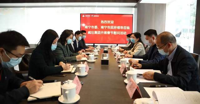 1月29日,中共南宁市委常委、统战部部长严丽萍率队到广西威壮集团金投中心项目展开春节慰问活动。期间,广西威壮集团董事长黄东介绍了集团的各业务板块的运营情况与发展理念。严部长对集团“大健康大文旅”产业的布局和发展,以及集团对广西体育事业做出的积极贡献给予了充分肯定,对支持南宁市委统战部组织的“霞光天使同心计划”等扶贫抗疫工作表示高度赞誉,鼓励公司2021年取得更大的发展和业绩,不断把企业做大做强,为推动强首府发展战略做出新贡献。