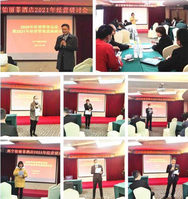 南宁铂丽菲酒店和防城港萨维尔酒店分别对2020年度工作进行总结,并作了2021年工作计划汇报及针对营销与服务质量方面,作了专题汇报与分享。