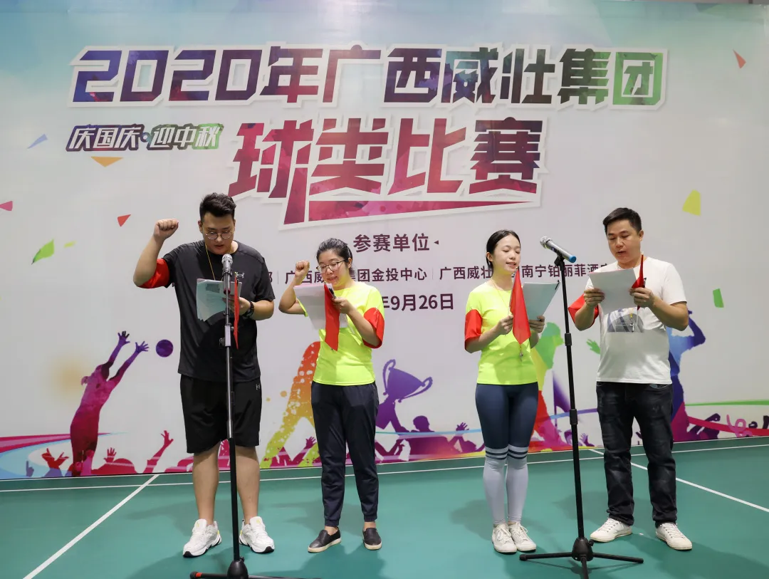 9月26日,为庆贺中华人民共和国成立71周年,展现集团职工爱国热情以及健康向上、充满活力的精神风貌,广西威壮集团总部特联合旗下金投中心项目、南宁铂丽菲酒店于李宁体育园举行“庆国庆·迎中秋”2020年企业职工球类比赛。集团总经理刘超亲临现场为各位运动健将们加油鼓劲!