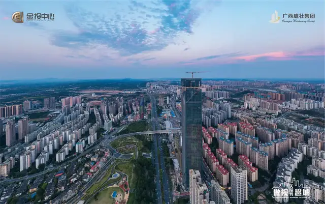 广西威壮集团旗下,民族大道头排、东盟商务区核心330米甲级写字楼——金投中心4月主楼幕墙整体形象安装至69层,计划5月底完成四面幕墙安装,7月底完成裙楼幕墙施工。同期项目主楼内部工程(消防、水电)已整体完成约90%的工程量,精装、园林工程施工按计划稳步推进中。