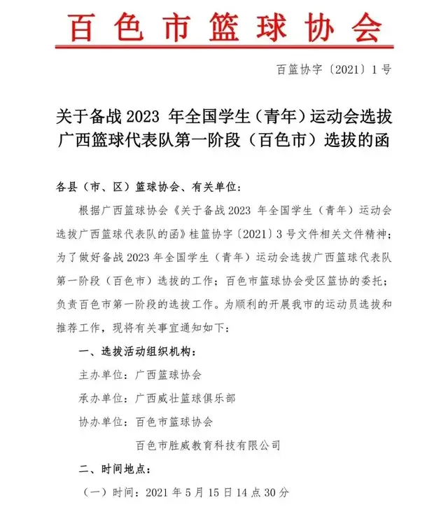 由广西篮球协会主办、广西威壮篮球俱乐部承办的备战2023年全国学生(青年)运动会广西篮球代表队选拔活动进入第一阶段选拔,百色市篮协负责百色市第一阶段选拔工作,并计划于5月15日开启选拔。