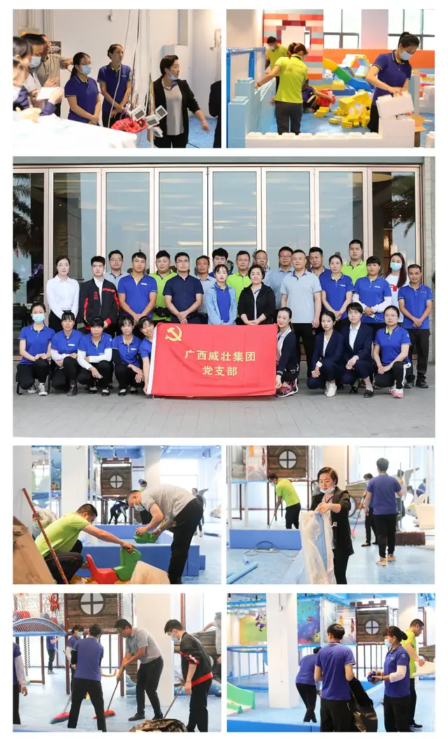 4月29日,广西威壮集团防城港党支部与萨维尔酒店管理层人员联合开展“创造优雅环境,迎四方游客”党日活动,全体党员、入党申请人对萨维尔酒店的儿童乐园设施进行清洁。威壮党员通过清扫园内垃圾、擦拭设施和码放物品,用实际行动践行雷锋精神,用勤劳双手为孩子们创造干净、舒适的玩耍空间。