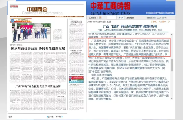 5月6日,《中华工商时报》报纸刊登文章——“广西“四好”商会掀起党史学习教育热潮”。文中,广西玉商总会、南宁玉林商会会长企业——广西威壮集团综合党支部以及玉林党支部、防城港党支部分别召开了支部组织生活会和民主评议党员大会,各支部从党史学习中汲取智慧与力量,全面学习贯彻全国两会精神。威壮集团董事长黄东表示,要把"学党史"融入企业发展,坚守实业主业,致力创业创新,真抓实干促发展,推动企业不断向前发展,为社会作出更大贡献,向建党100周年献礼。