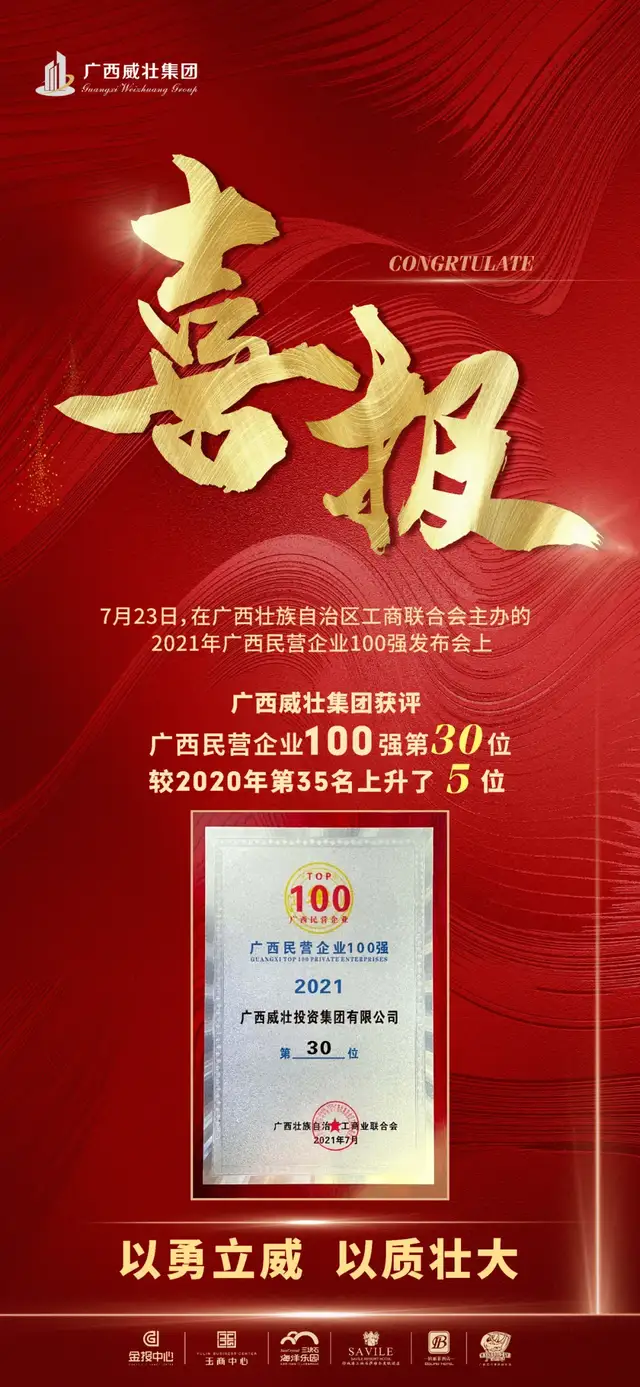 7月23日,由广西壮族自治区工商联、百色市人民政府主办,自治区科技厅、自治区工业和信息化厅、广西税务局、建设银行广西区分行协办的2021广西民营企业100强发布会在百色市举行,会上发布2021广西民营企业100强调研分析报告。在公布的100强榜单中,广西威壮集团位居榜单第30位,相比去年2020年提升了5位。广西威壮集团董事长黄东出席了本次发布会,并代表企业上台领奖。