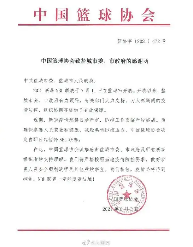8月3日,因新冠疫情形势日趋严重,为确保参赛人员安全和健康,中国篮球协会决定暂停2021年NBL联赛。