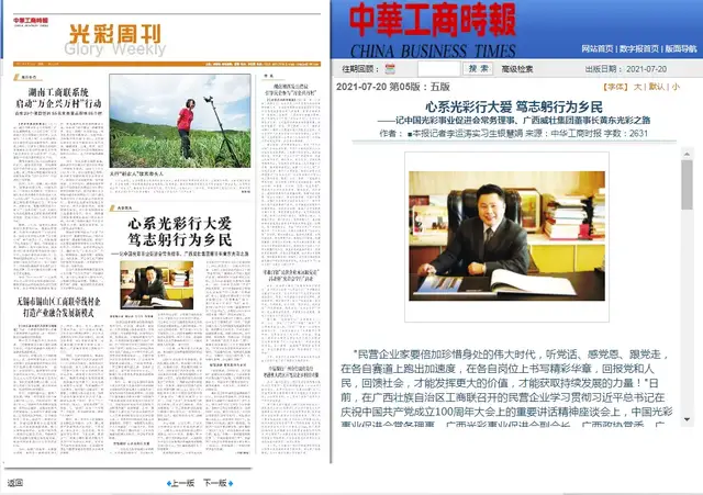 7月20日,中华工商时报登刊了《心系光彩行大爱 笃志躬行为乡民 ——记中国光彩事业促进会常务理事、广西威壮集团董事长黄东光彩之路》一文,介绍了广西威壮集团董事长黄东“听党话、感党恩、跟党走”“党旗领航心系光彩行大爱”“致富思源笃志躬行为乡民”的光彩之路。
