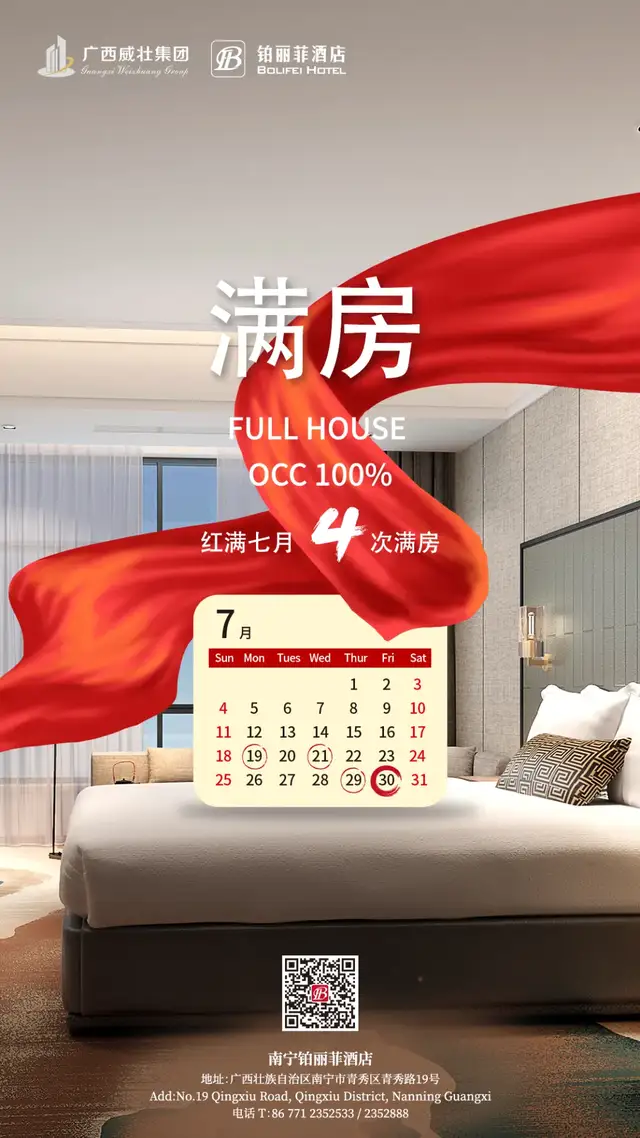 7月,南宁铂丽菲酒店迎来暑期客流高峰,客房4次预约爆满。其中,7月30、31日连续2天满房,酒店进入暑期客房接待高峰期。