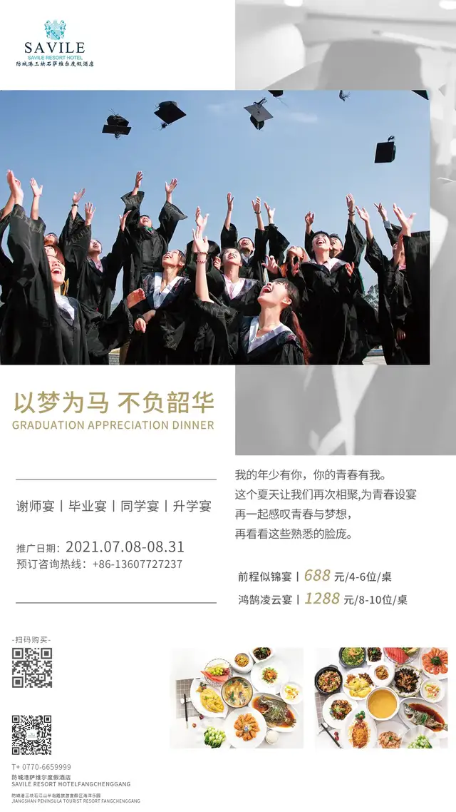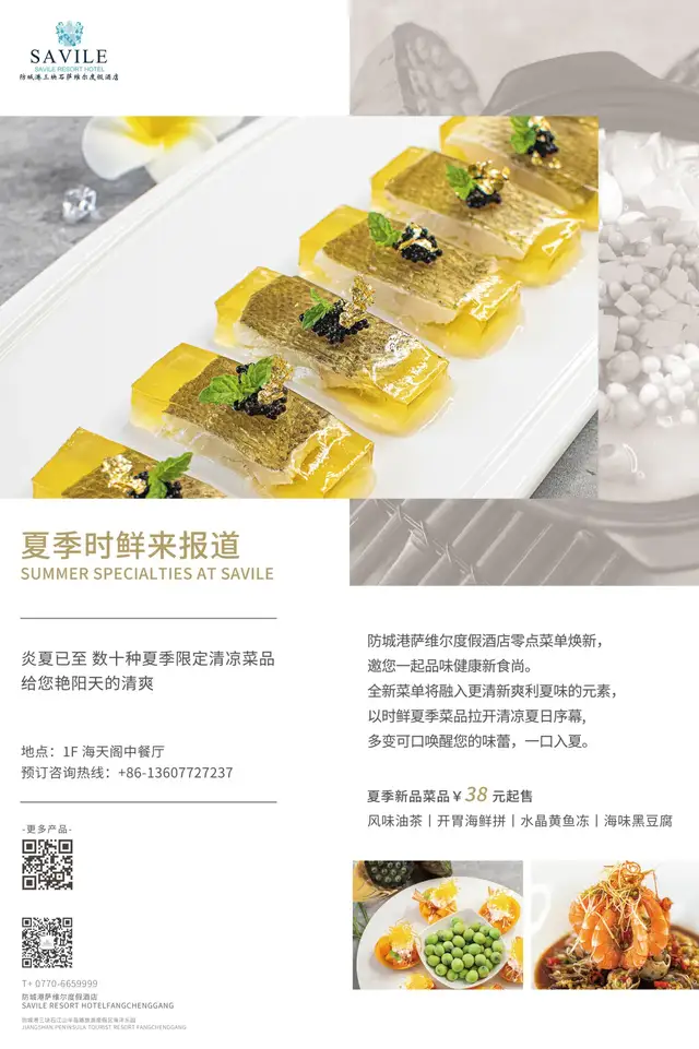 同期,防城港萨维尔度假酒店还推出了7月毕业季浓情优惠套餐活动、海天阁中餐厅全新套餐上新优惠活动、“菜单焕新·邀您品味健康新食尚”时鲜夏季菜品鲜尝优惠活动等优惠上新活动,共同拉开了防城港清凉夏日聚餐优惠尝鲜序幕。