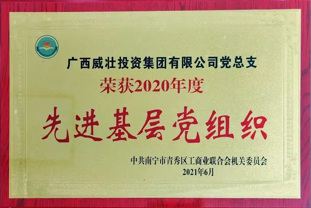 2021月7日,广西威壮集团党总支分别获得南宁市青秀区党委、青秀区工商联机关党委授予的“2020年度先进基层党组织”称号,集团党总支已连续6年获得“先进基层党组织”称号。叶卫东、许超2名同志荣获“优秀党务工作者”称号,金富盈、杨方舟、覃秋娟、刘芬、邓礼成5名同志荣获“优秀党务工作者”称号,白宇同志荣获“优秀信息员”称号。