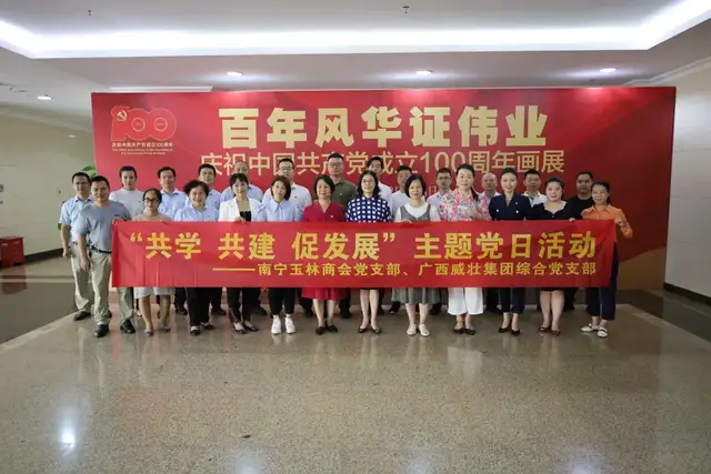 8月19日,广西威壮集团综合党支部与南宁玉林商会党支部开展以“共学、共建、促发展”为主题的联合党建活动,广西威壮集团党总支书记叶卫东、广西威壮集团综合党支部书记杨方舟、南宁玉林商会党支部书记陈小宁、南宁玉林商会秘书长黄晓丽以及双方党支部的党员、入党积极分子共20余人参加了本次活动。