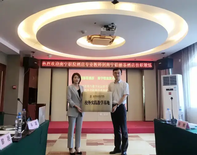 南宁铂丽菲酒店对本次实践活动高度重视,酒店副总经理韦霞在会议上对老师们的到来表示诚挚欢迎。她希望通过本次活动,能够促进校企之间深度人才培养及合作。方堃副教授则表示,希望通过本次实践活动,让教学成果更贴合企业实际需求。会议的最后,双方进行了“南宁职业技术学院酒店管理与数字化运营专业教师校外实践教学基地”授牌仪式。