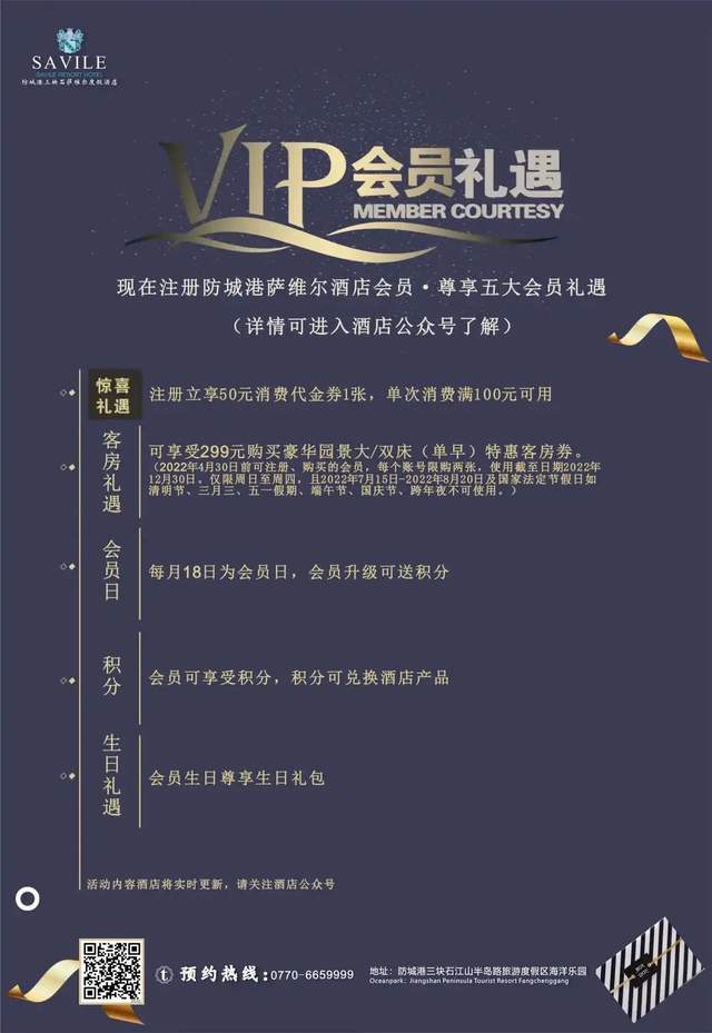 防城港萨维尔度假酒店灵活调整前台价格权限,积极与第三方洽谈客房包价,严格遵循“不错过任何一个客人”的工作原则,每日推出低价引流房。2月在大玩家、聚惠天下、直客通等平台推广的“情人节套餐”“客房红酒搭配情侣套餐”等优惠活动,反响强烈。现在,加入萨维尔酒店会员,立享五大礼遇!